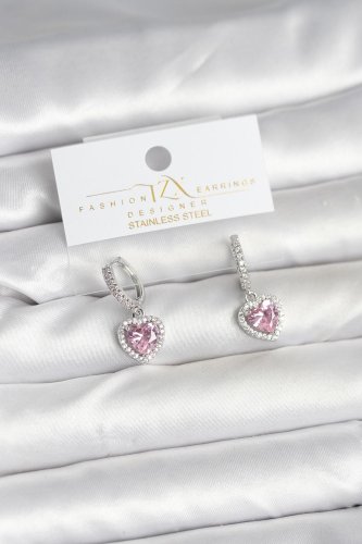 Pirinç Gümüş Pembe Renk Zirkon Taşlı Kalp Model Kadın Küpe