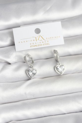 Pirinç Gümüş Renk Zirkon Taşlı Kalp Model Kadın Küpe