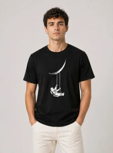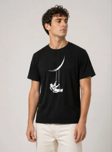 Erkek Astronot Ay Temalı Tişört Kısa Kol Yazlık Bisiklet Yaka TShirt Siyah