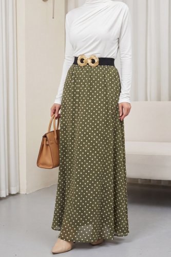 Puantiyeli Beli Lastikli Astarlı Şifon Etek Haki