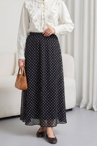 Puantiyeli Beli Lastikli Astarlı Şifon Etek Siyah